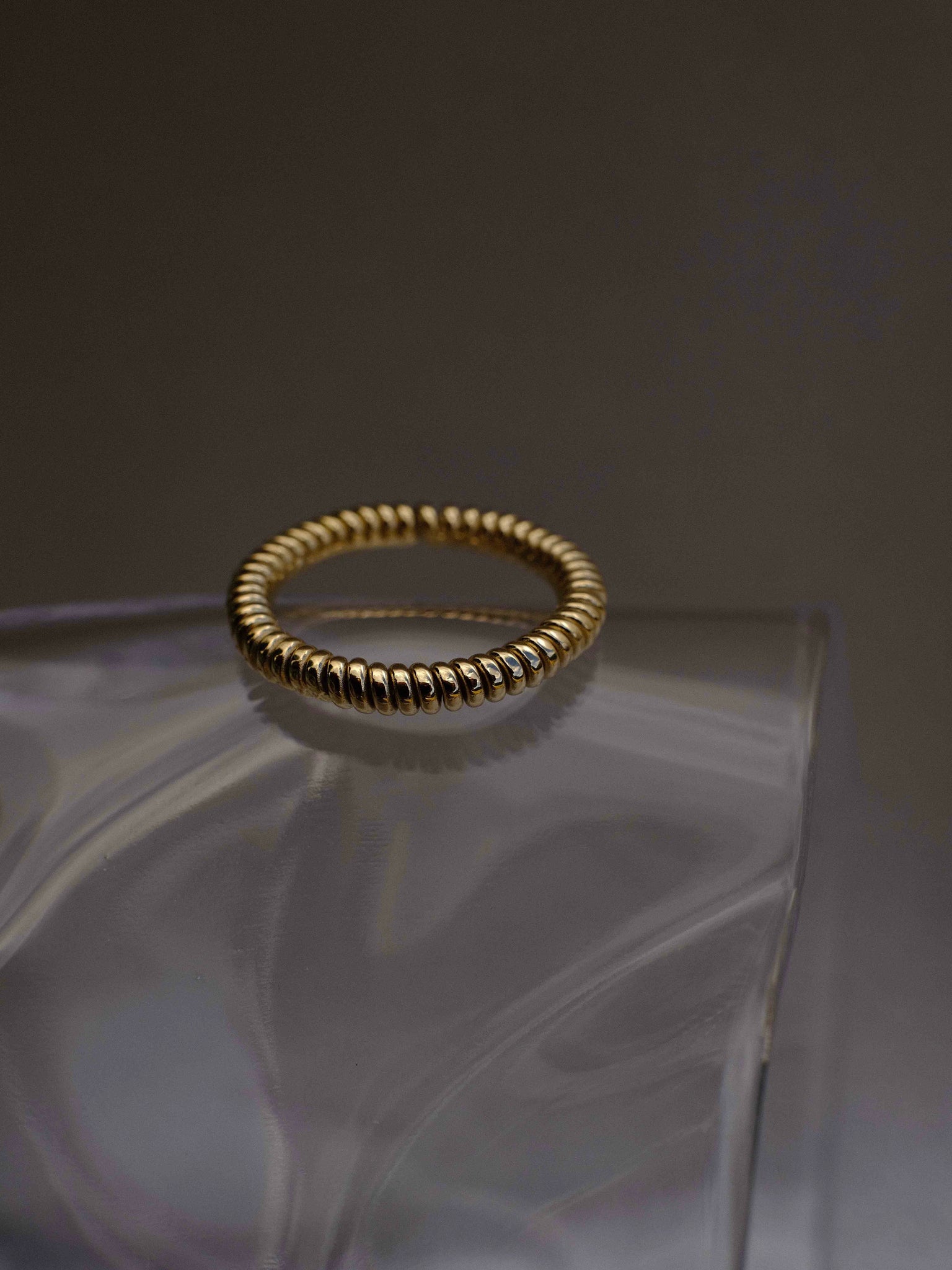 The 'Slinky Ring' is handmade in wax and cast in solid recycled gold. The slinky ring measures 3x3mm.