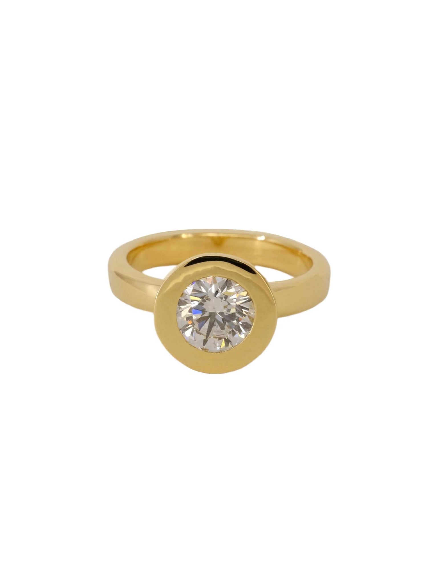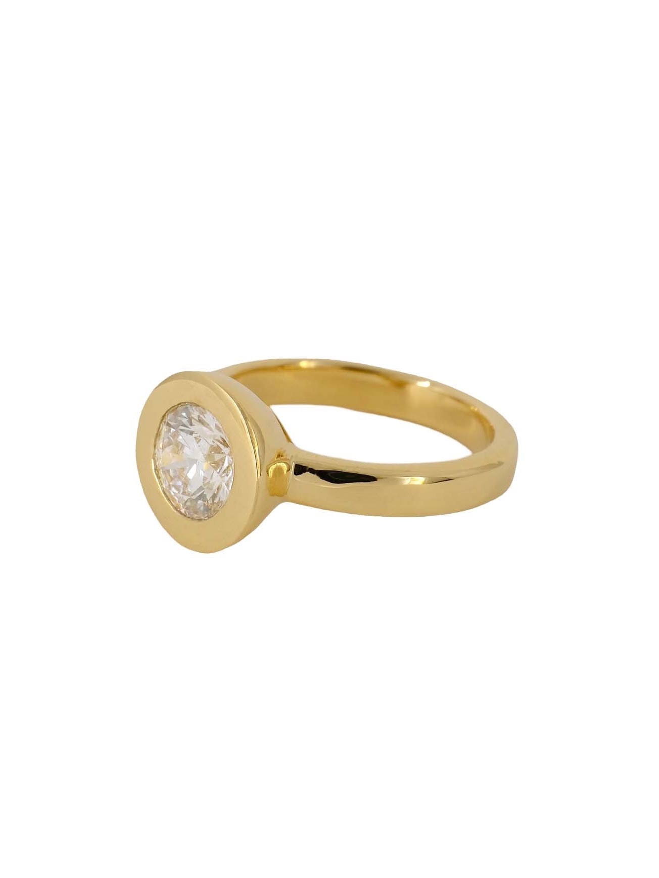 The 'CER.' Features a 1ct diamond set in a thick bezel style to create a modern and timeless piece. Available with either a natural or certified lab grown diamond. The Natural diamond is a GSi1 1ct 5.9-6mm round, The Lab grown diamond is a certified GSI1 6mm round roughly 0.8-0.85ct. This ring is available In recycled 9ct, 14ct and 18ct yellow gold. The face measures roughly 9.5 mm and the band measures 3x2mm.