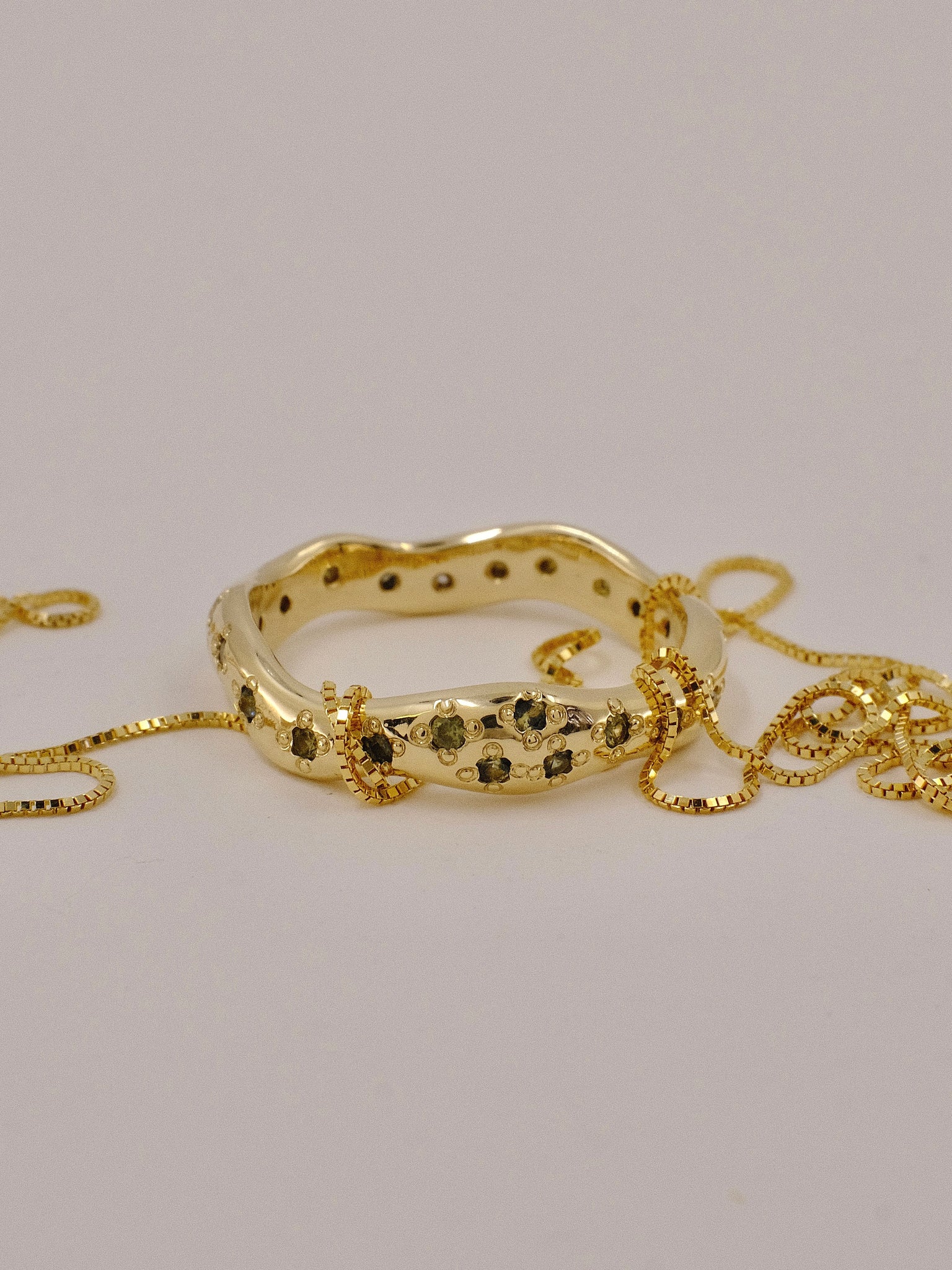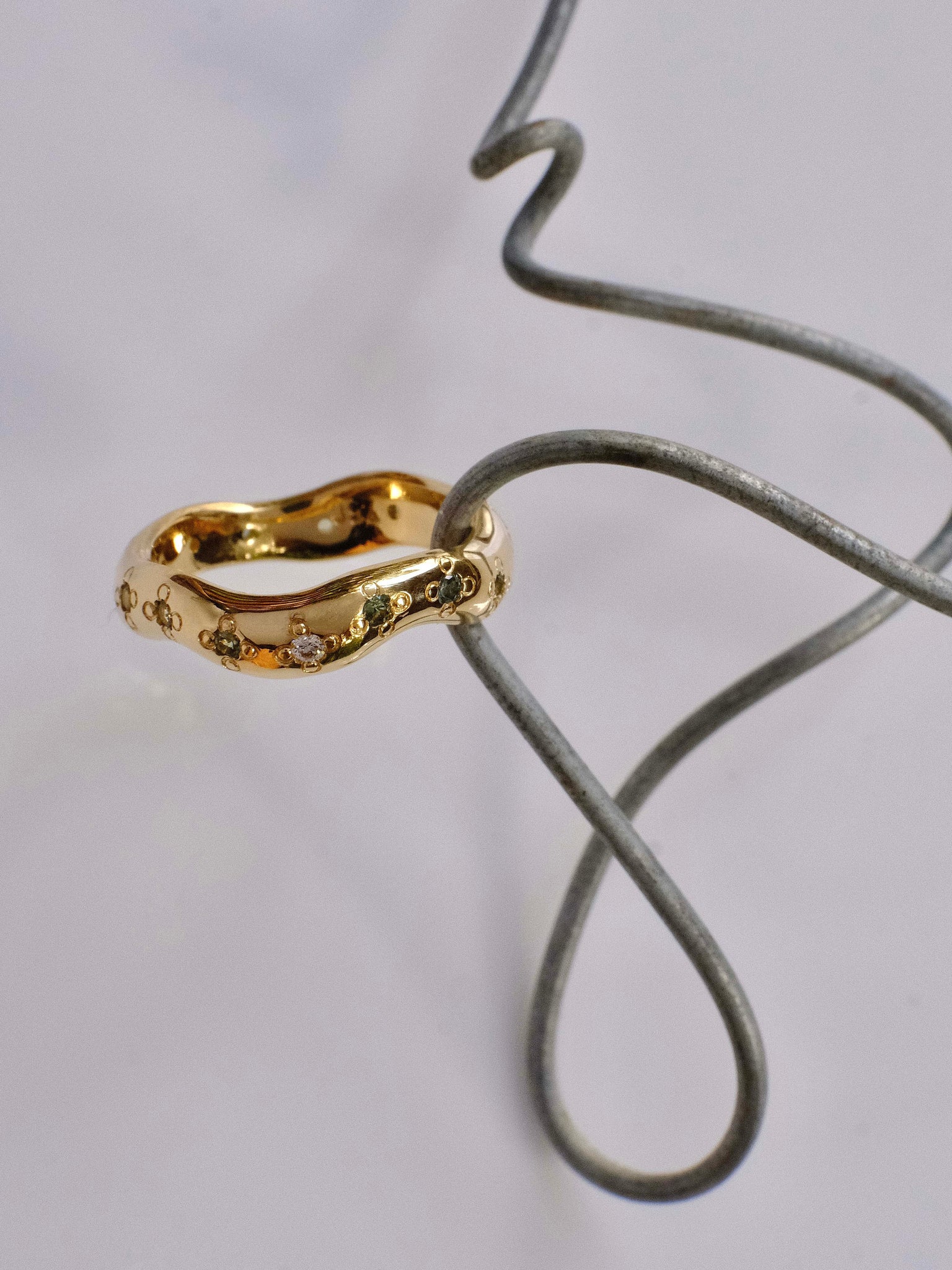 The 'Diamond in the rough band', an organic shaped band set with 21 x 1.5mm round natural Australian parti sapphires and 1 x 1.5mm round natural diamond. Available in recycled 9ct, 14ct and 18ct yellow gold.