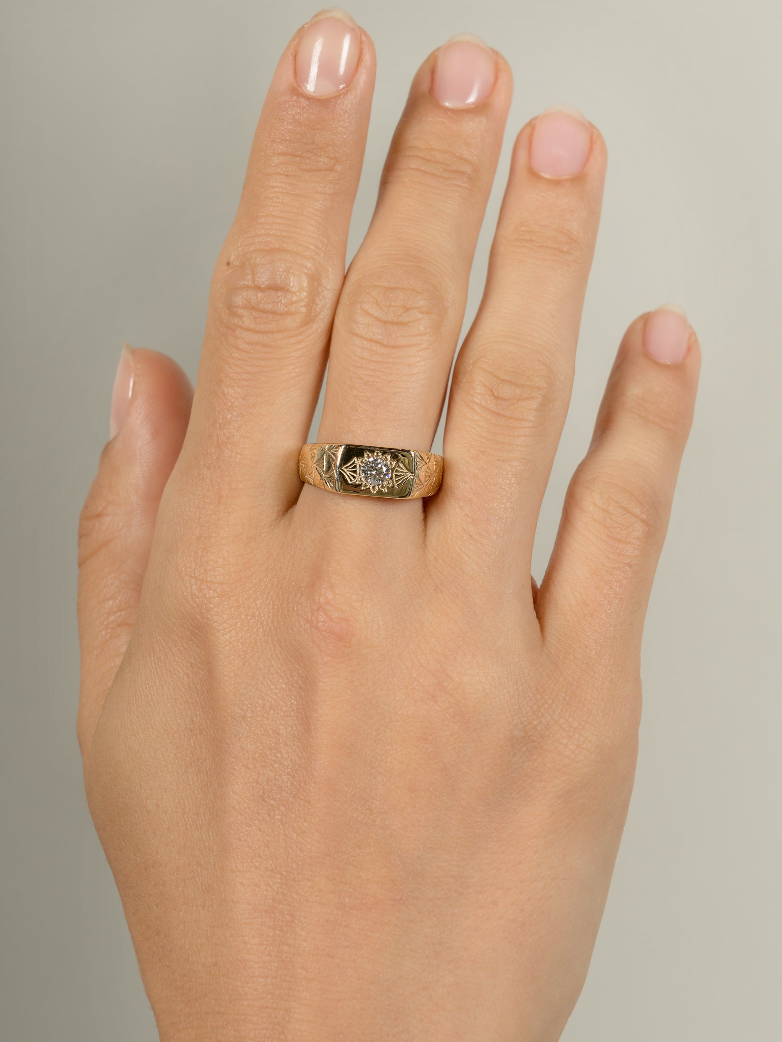 A yellow gold band ring with a single central diamond, featuring hand-engraved fan motifs on the band and face.