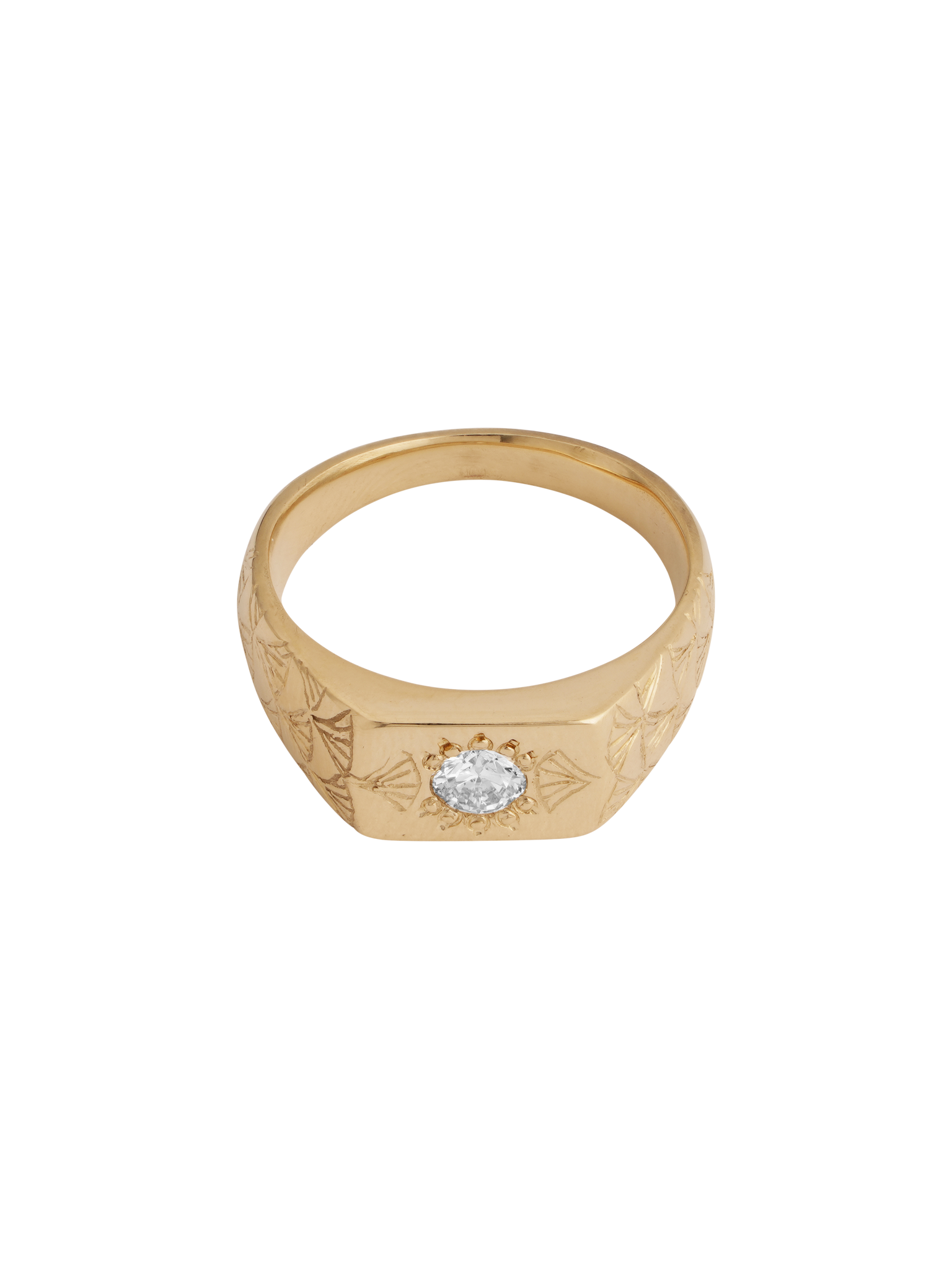 The 'Nile Ring' is handcrafted in solid 9ct Yellow Gold. This piece is available with a choice of three center stones: a 4mm natural GSi1 Diamond, a 4mm Parti-sapphire, or a 4mm green Tourmaline.The Nile Ring features a subtle hand-engraved fan motif on the band and face.