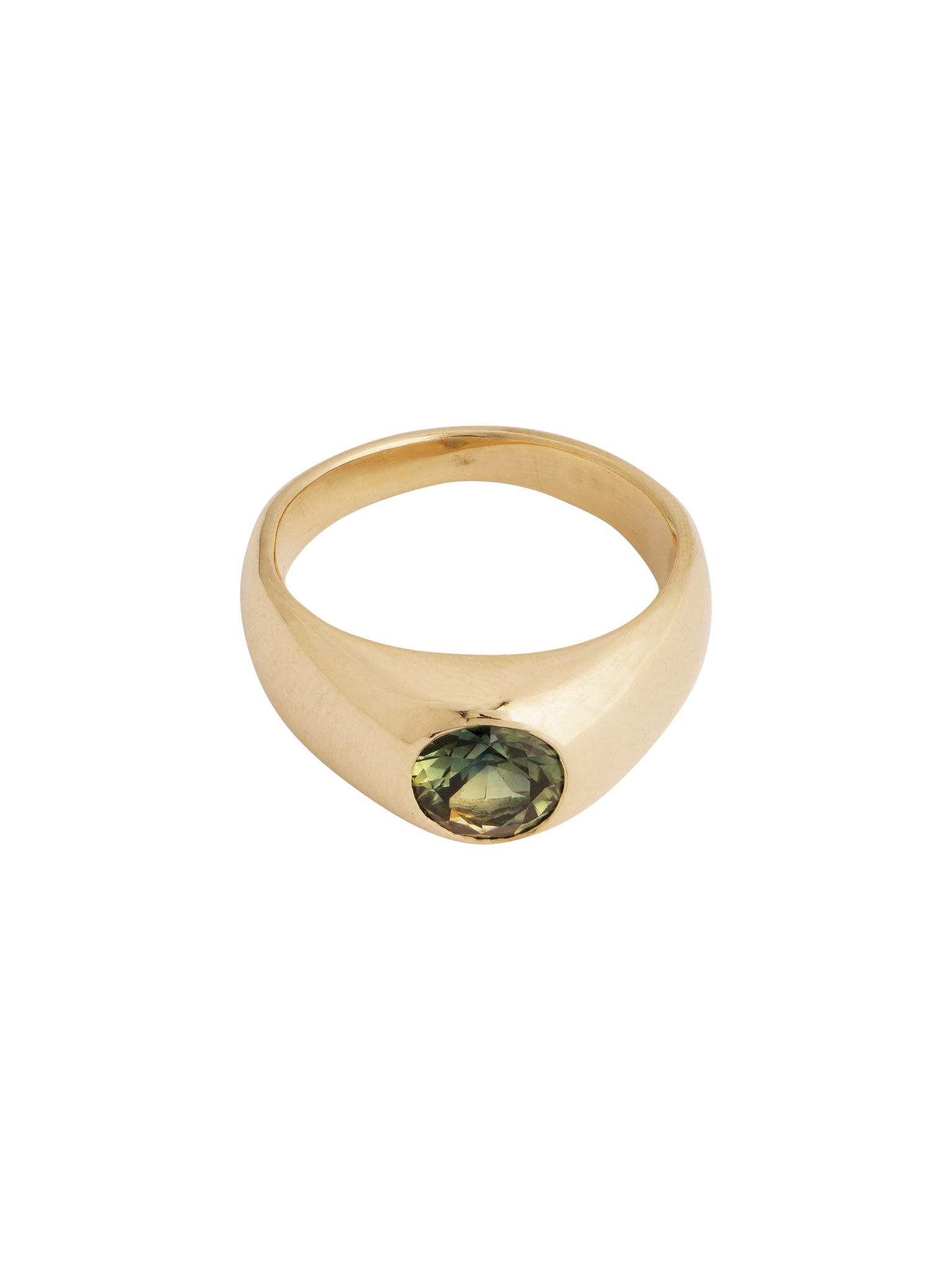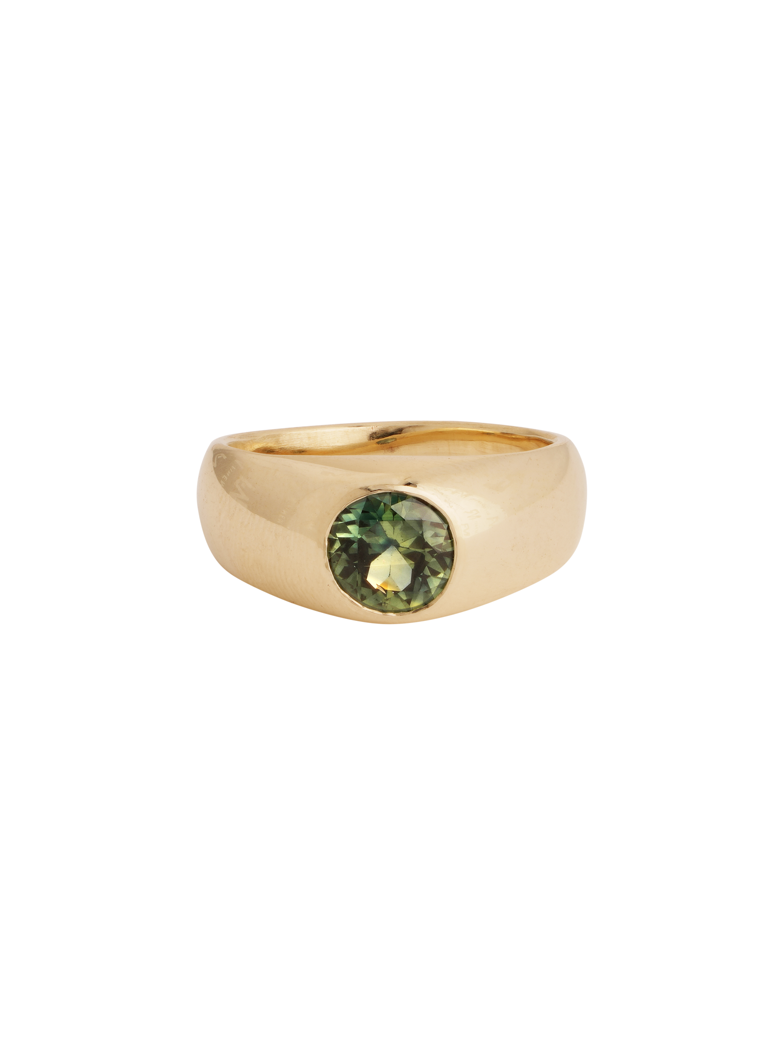 The "Sapphire Tapa Ring," a handcrafted piece by Olivia Ware in her Melbourne studio. This ring features a natural 1.4ct, 6.5mm round Australian teal sapphire, set in your choice of either 9ct or 18ct yellow gold. The ring's design measures 8.5mm in width, tapering down to 3mm at the back of the band.