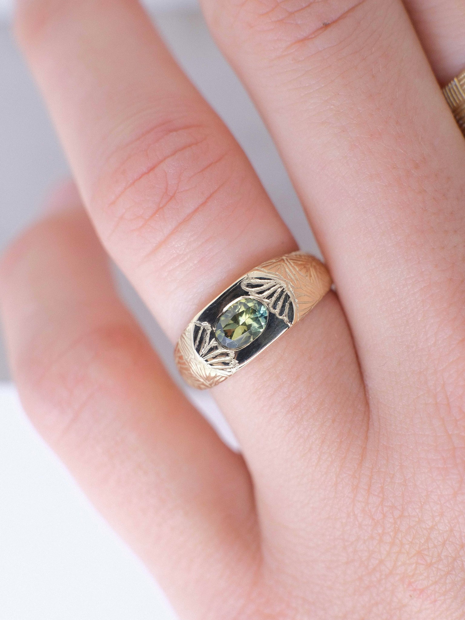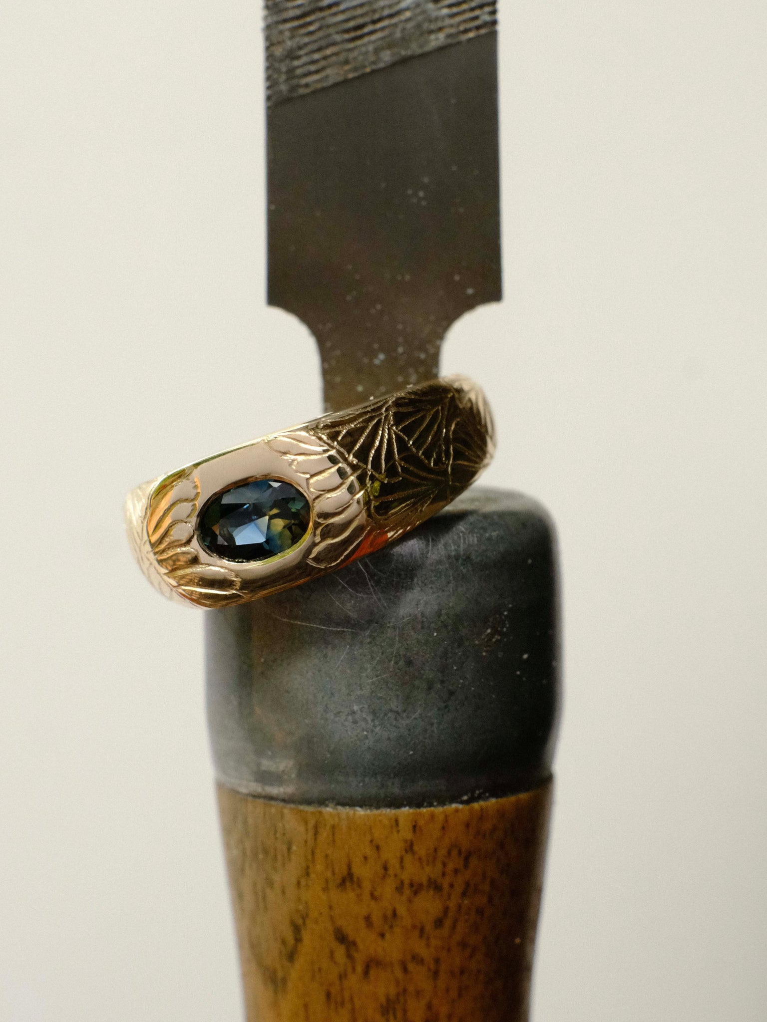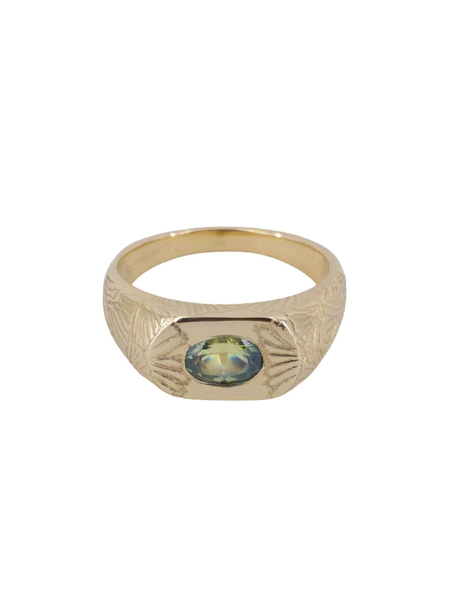 The 'Ginkgo Signet' ring, a 6x4mm natural Australian parti sapphire flush set at the centre. The ring showcases Olivia Ware's hand-engraved ginkgo leaf design on the face and extending onto the band. Made in solid 9ct yellow gold. It's approximately 12mm in width by 7mm in height, with a depth of about 3mm.