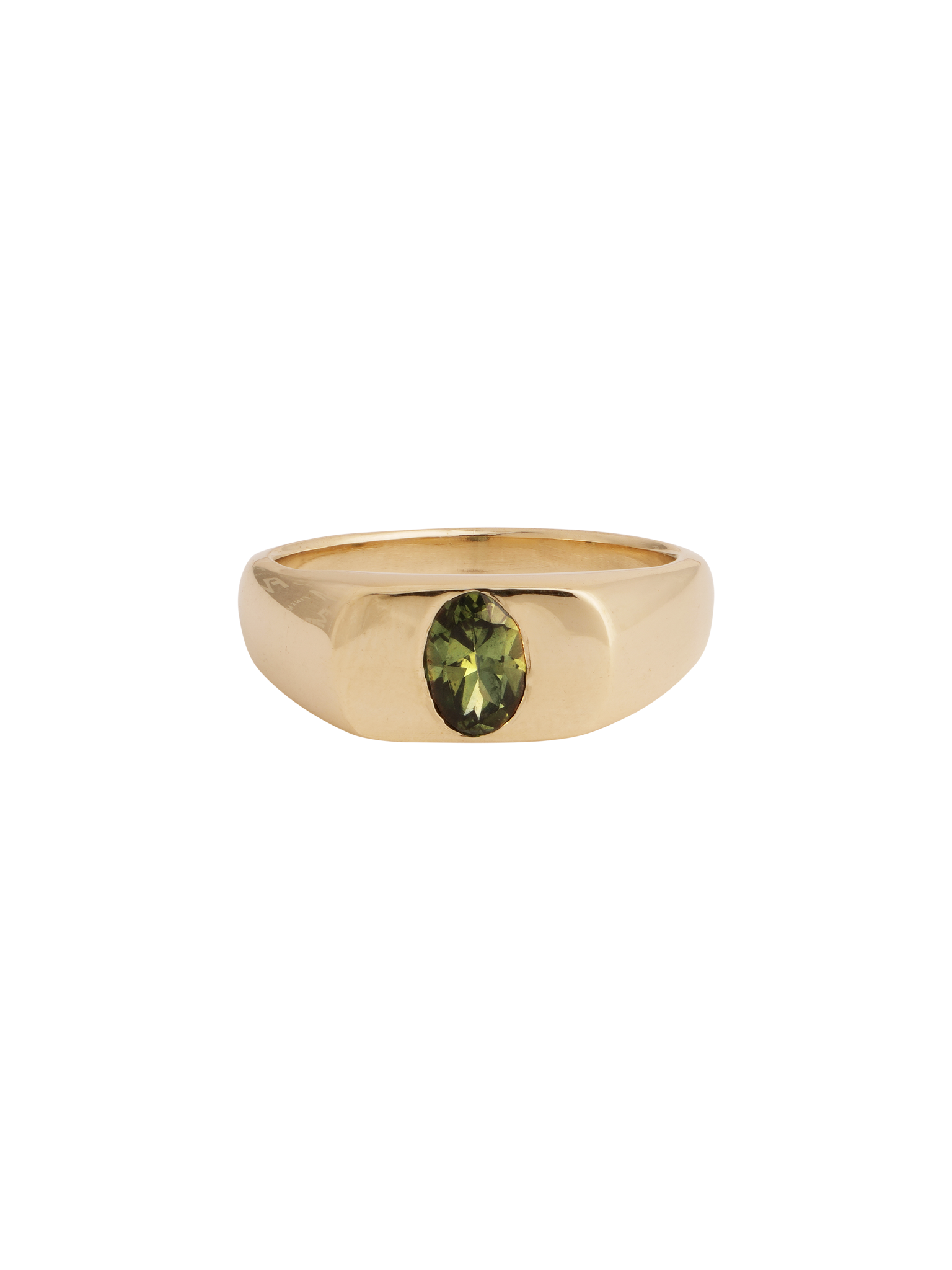 the 'Mask' Signet, a carefully crafted ring available in solid 9ct yellow gold or silver. This signet features a 6x4mm Natural Australian Parti sapphire. The face of the ring measures 7mm in height, 12mm in width, with a thickness of 3mm. The band has a thickness of 2mm.