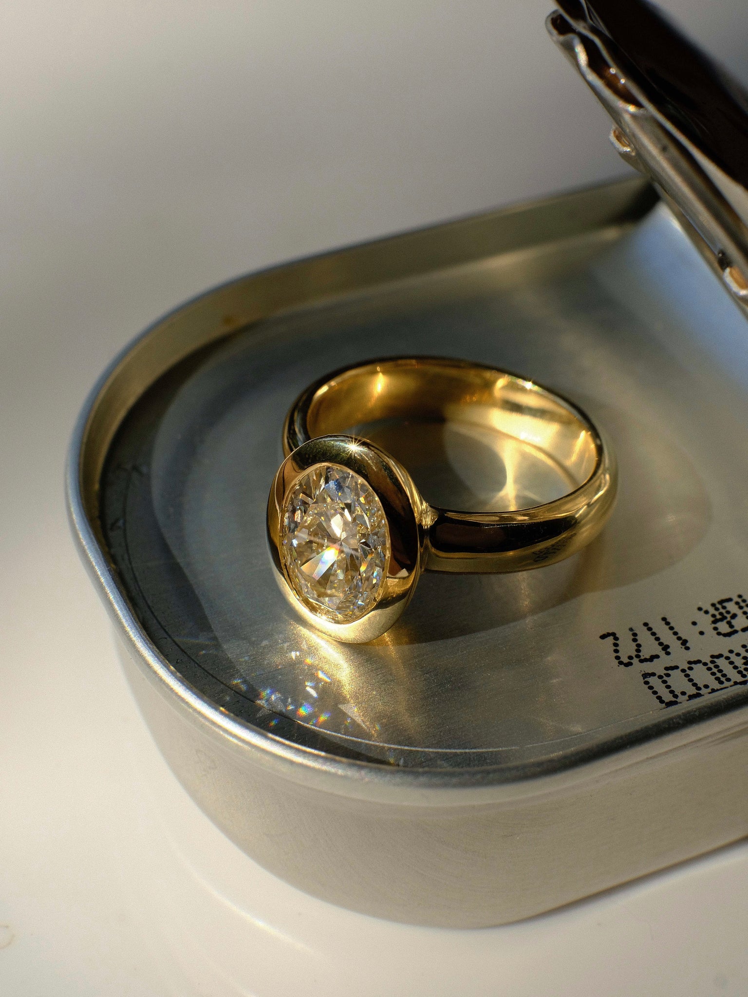 The Nova Engagement Ring is a modern heirloom in the making. Set in rich 14ct yellow gold, this piece features a breathtaking 2.47ct EVS2 oval diamond, measuring 10.61 x 7.61mm, set in a soft curved bezel with a 4.2mm half-round band.