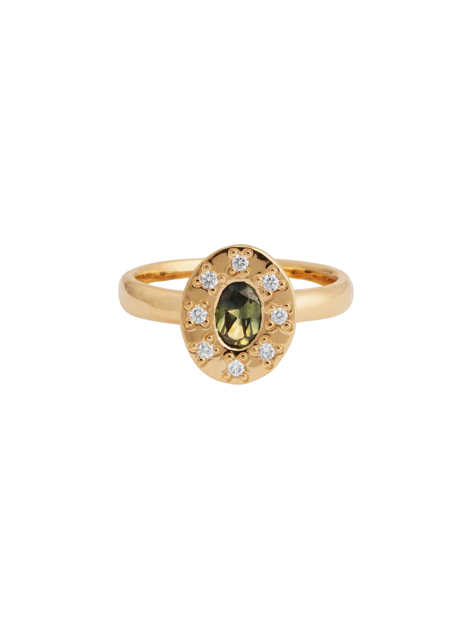 The 'Ginkgo Ring', available in 9ct, 14ct, or 18ct yellow gold options. This beautiful ring features a natural Australian parti-sapphire (6x4mm) surrounded by eight diamonds (1.5mm). The face of the ring measures 12mm x 10mm, and the band is 3mm x 1.5mm in size. The Ginkgo Ring showcases a delicate hand-engraved pattern beneath the setting. It is our interpretation of the beautiful ginkgo leaf.
