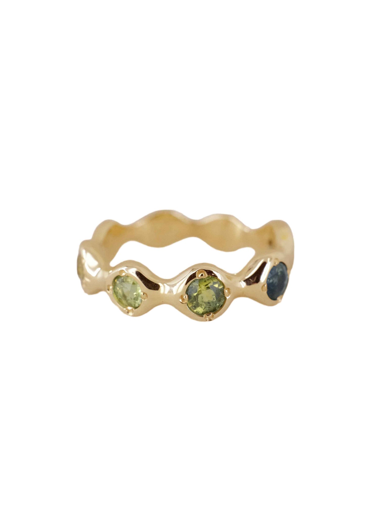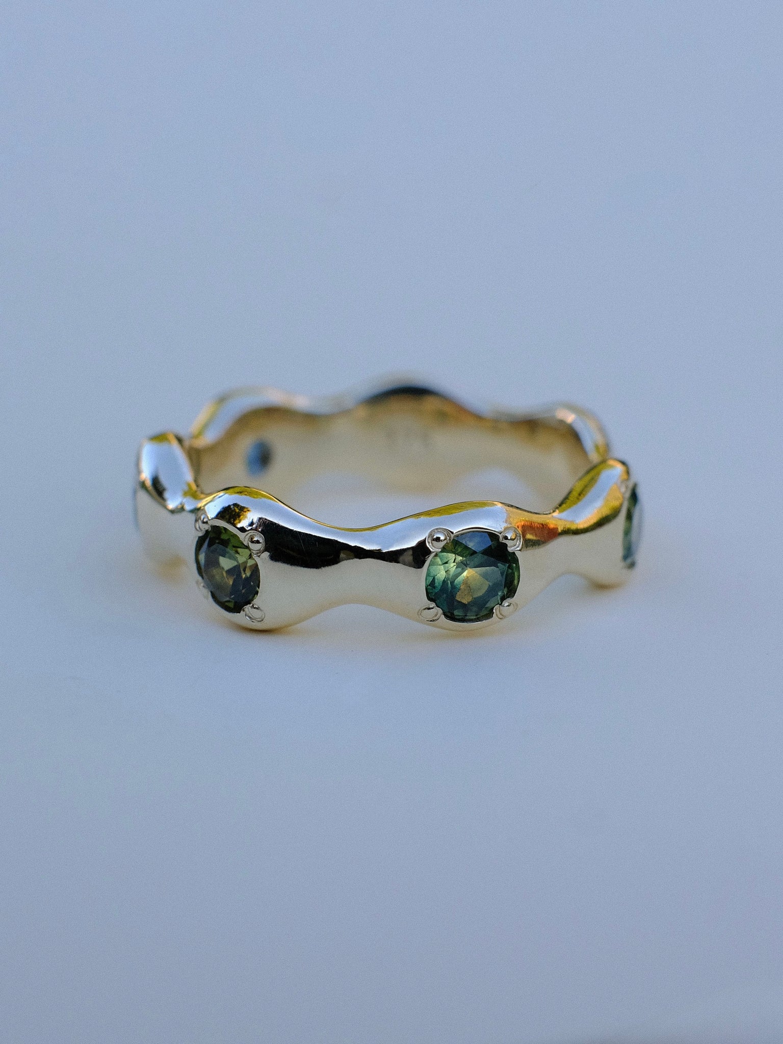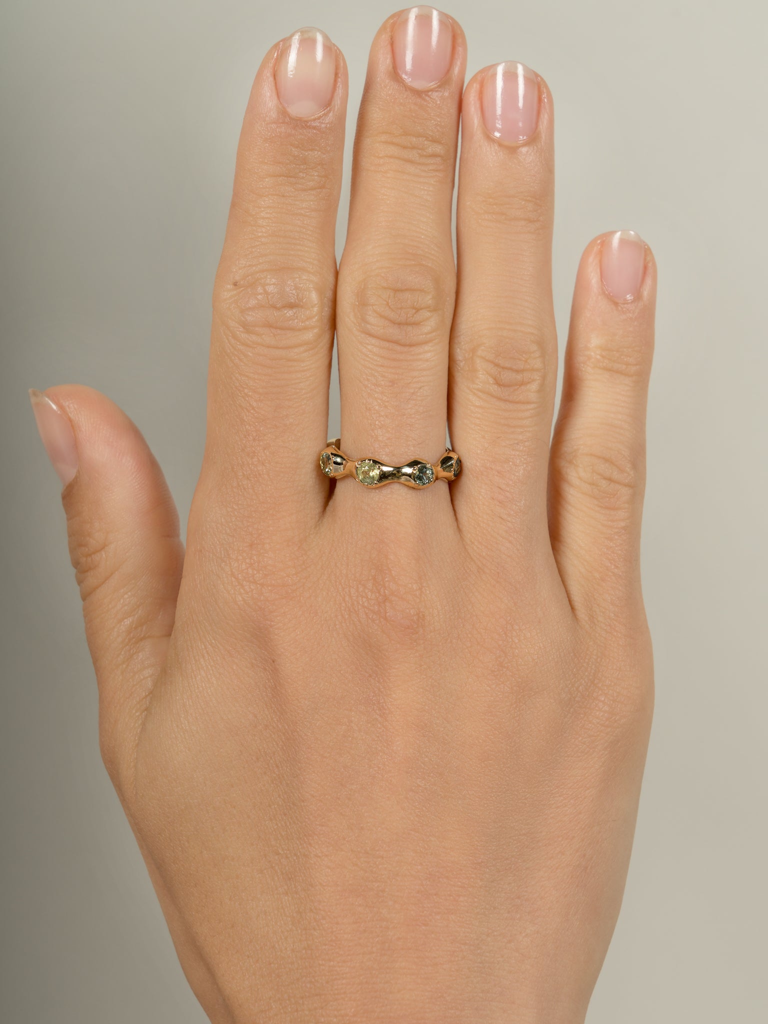 The 'Organic Sapphire Band', a beautifully crafted ring set with five natural Australian sapphires. Available in either 9ct or 18ct yellow gold, each ring is hand-carved to order. The sapphires chosen for this band are carefully selected to complement each other, offering a range of captivating colors, including yellow, light and dark green, and shades of blue. The sapphires are 3.5-4mm in size.