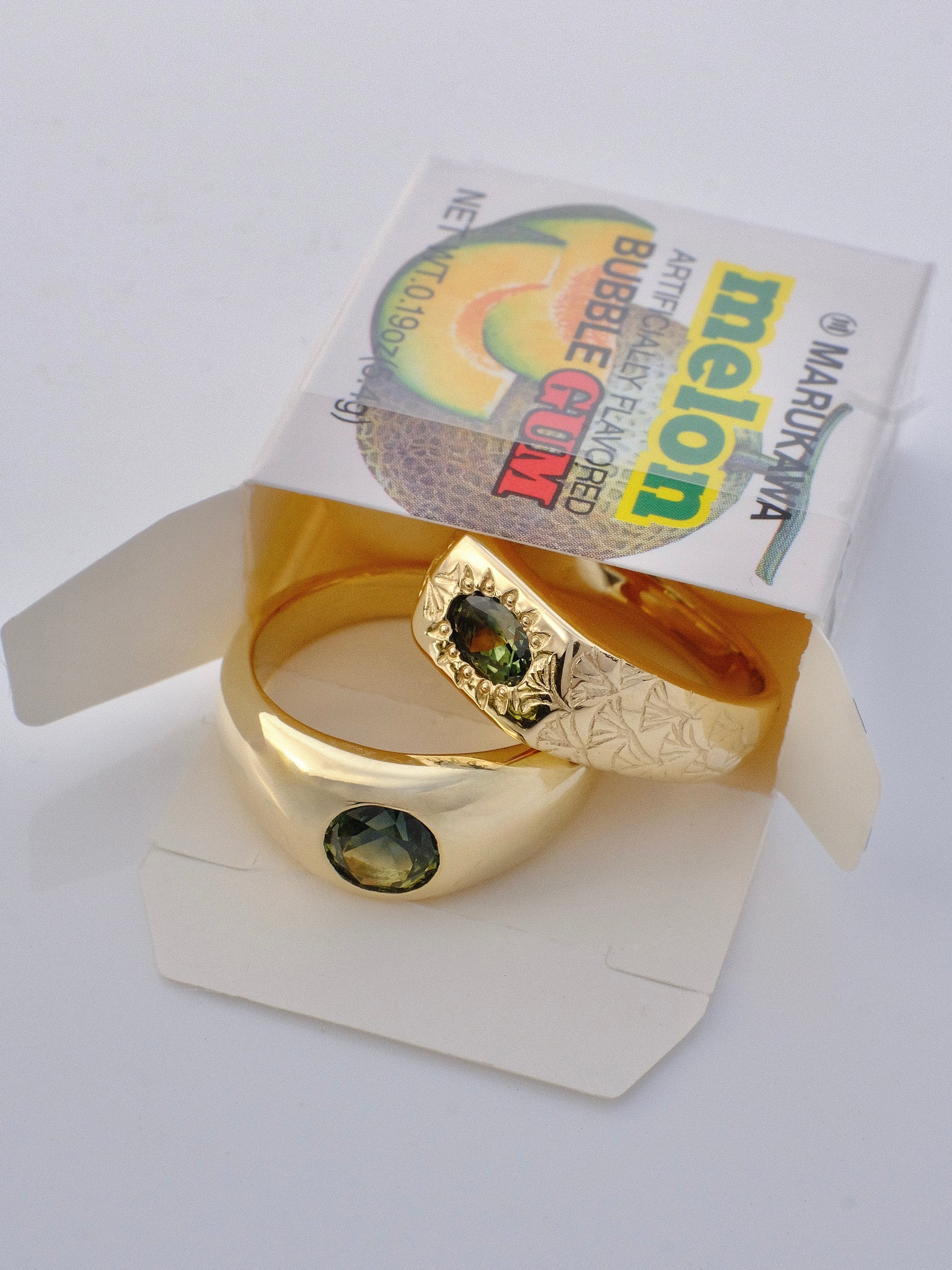 The 'Oval Nile Ring'. This ring is made in solid recycled 9ct yellow gold and features a natural Australian parti sapphire measuring 6x4mm. The face measures approximately 7mm in height by 11mm in width, with a depth of about 3.5mm. The ring features a hand-engraved art deco fan pattern on the edges of the face, extending down onto the band.